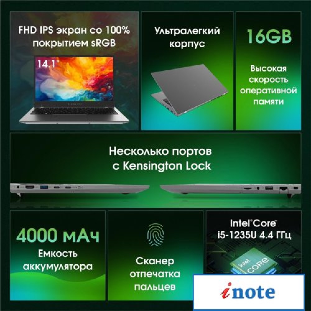 14.1" 1920 x 1080, IPS, 60 Гц, Intel Core i5 1235U, 16 ГБ DDR4, SSD 512 ГБ, видеокарта встроенная, Windows 11 Pro, цвет крышки серый, аккумулятор 45.6 Вт·ч